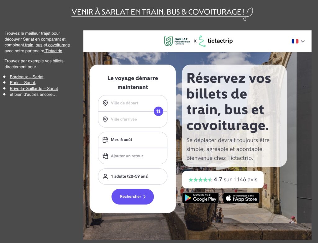 Tictactrip, c’est un comparateur de trajets multimodal qui permet de combiner train, bus, covoiturage et même vélo. En l’intégrant à sa page “Comment venir”, l’Office de Tourisme offre aux visiteurs une solution simple et intuitive pour organiser leur venue sans voiture individuelle.
